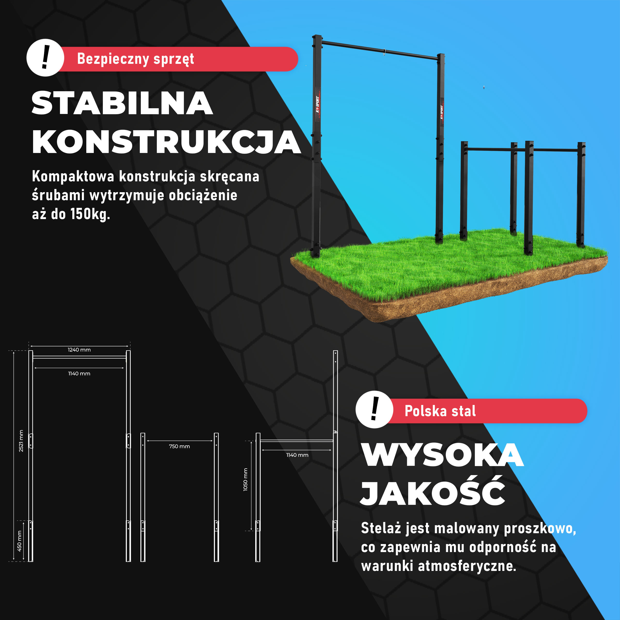 • Drążek połączony z poręczami to idealny sprzęt do ćwiczeń na dworze. Z jego pomocą przeprowadzisz rozbudowany trening kulturystyczny czy gimnastycznym. Wzmocnisz wiele grup mięśniowych, poprawisz wytrzymałość i gibkość.