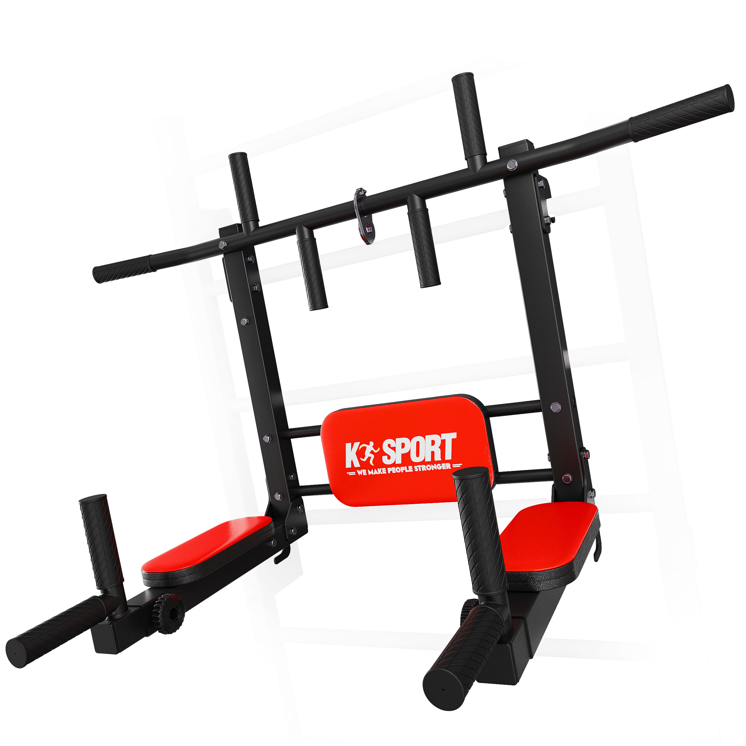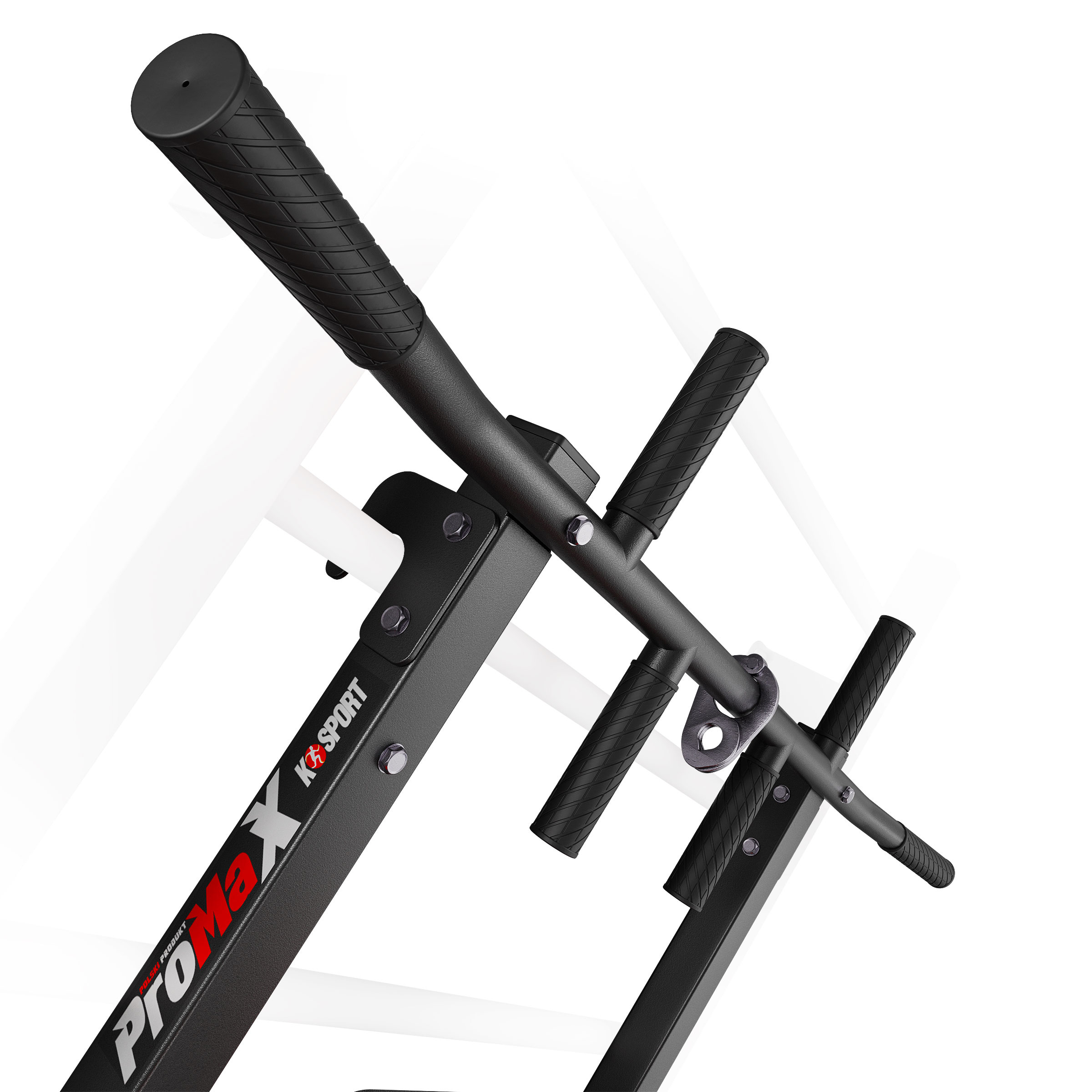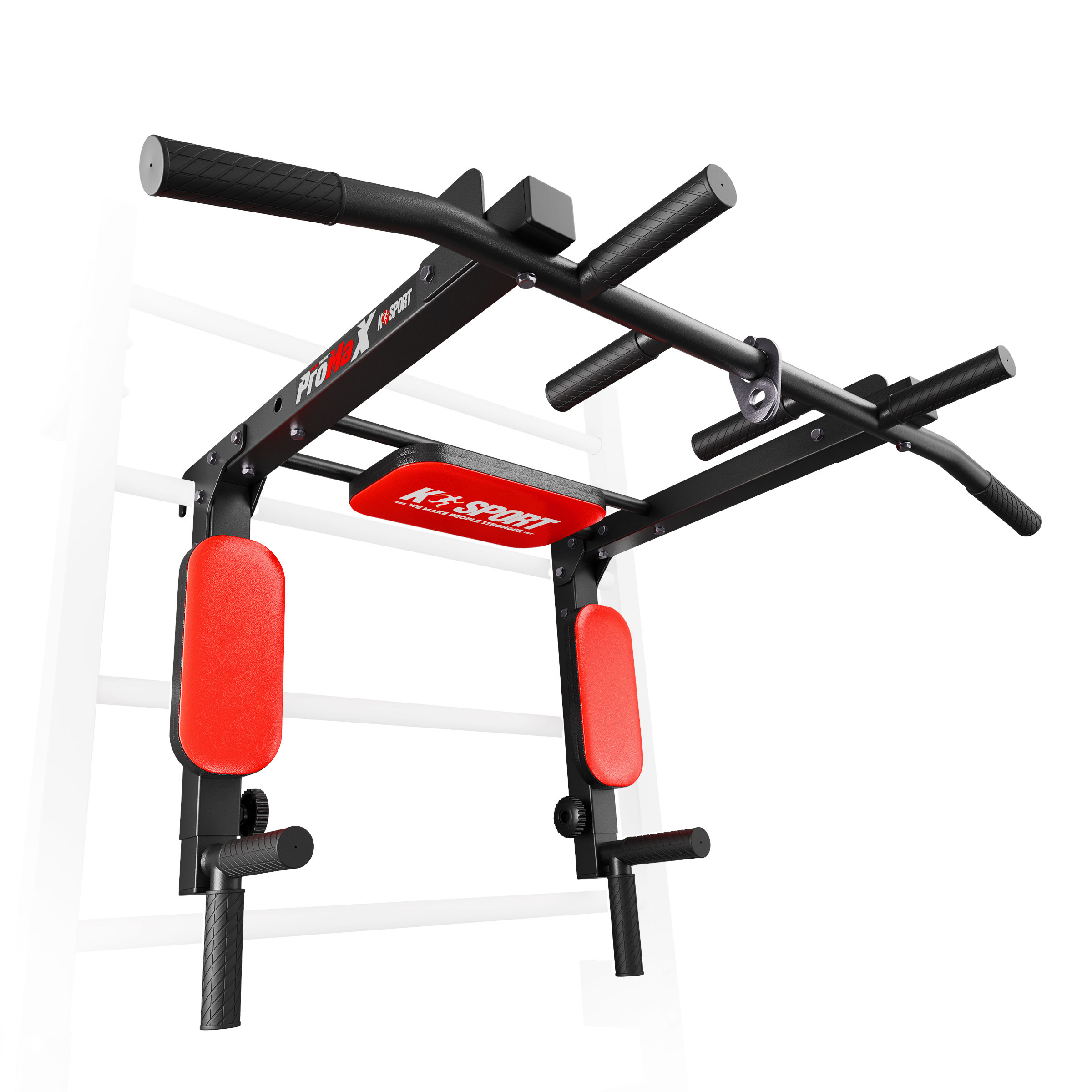• Sprzęt przeznaczony do montowania na drabince. Posiada dwa sposoby montażu, dzięki czemu można go używać jako drążka do podciągania lub poręczy do dipów. Wiele możliwości profesjonalnego treningu mięśni pleców i ramion dzięki pięciu różnym chwytom.