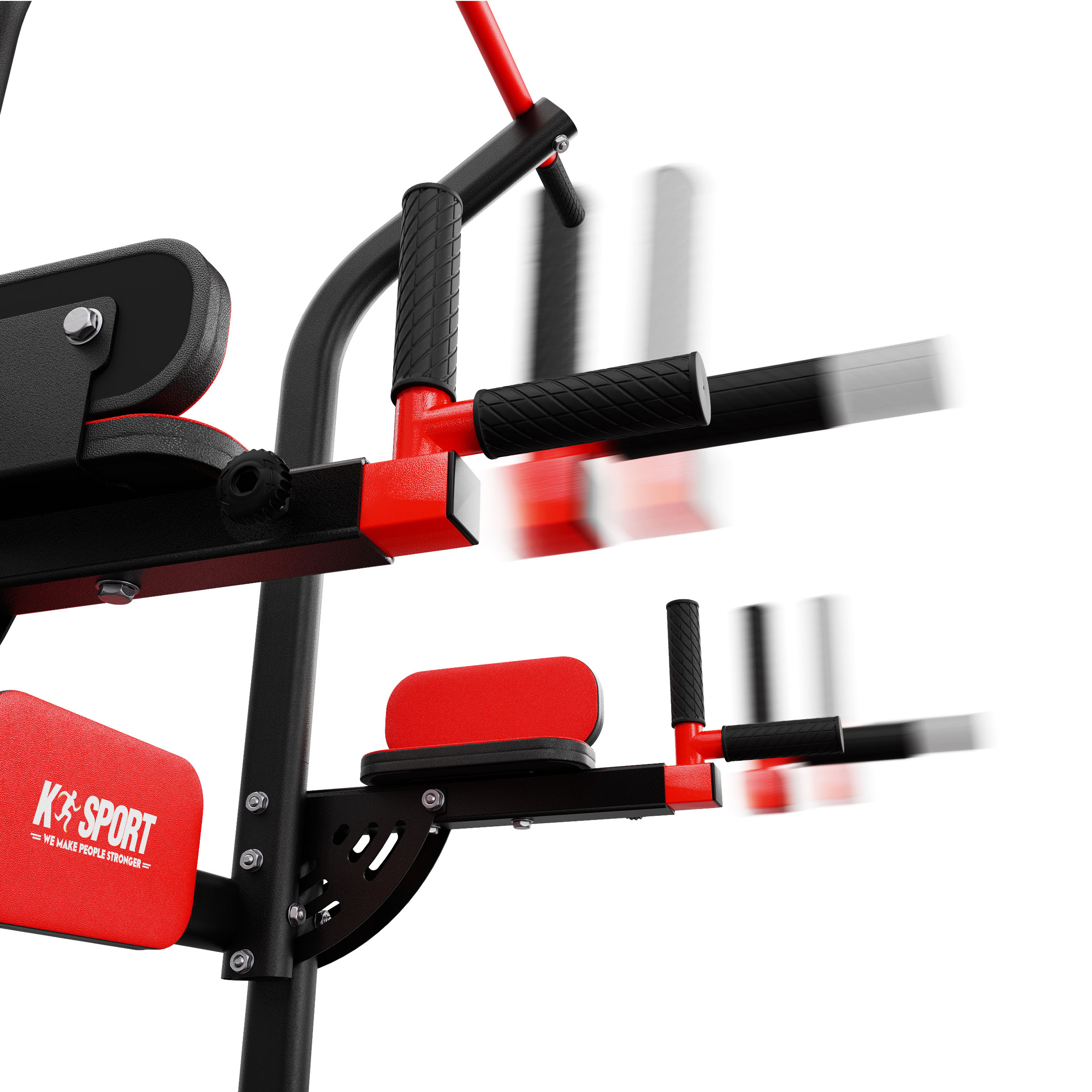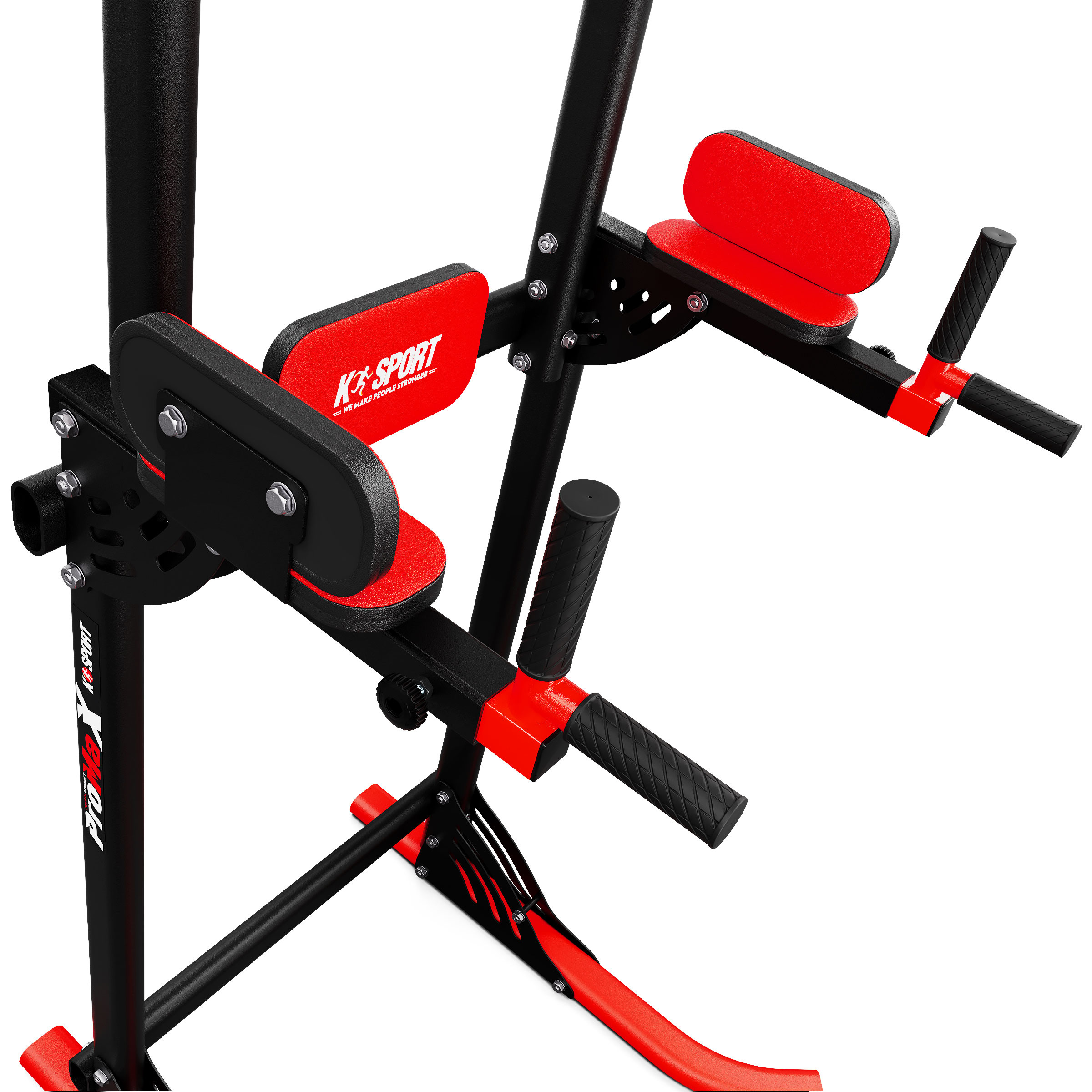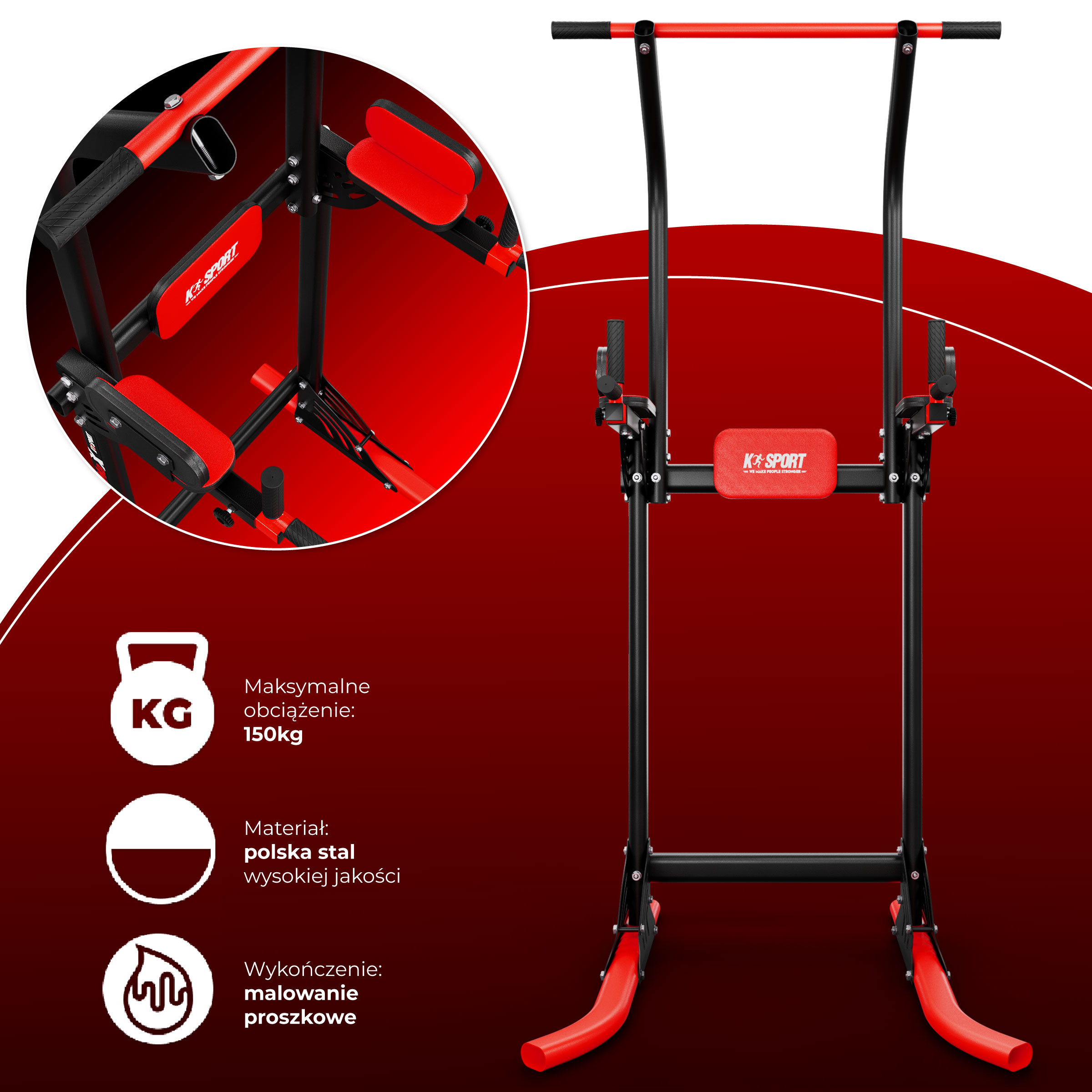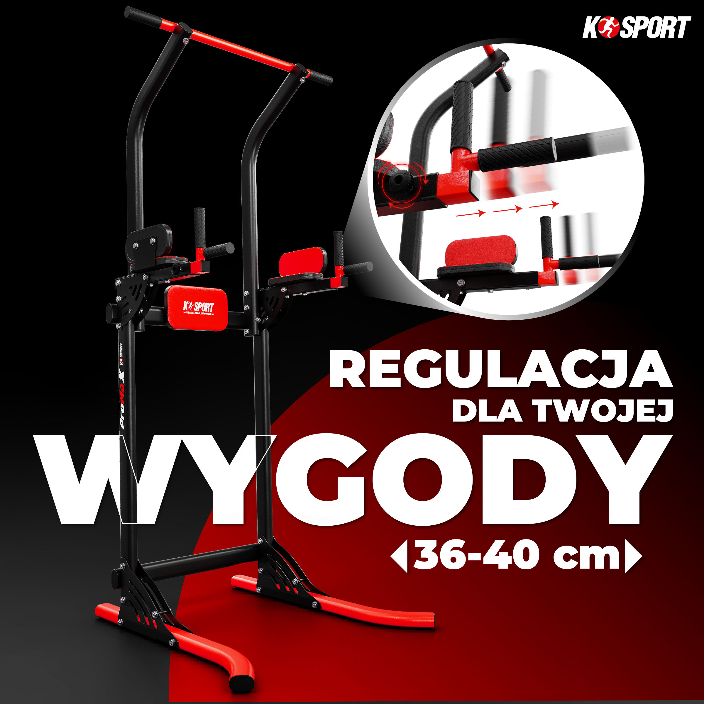 • Wszechstronny i stabilny drążek + poręcze z podłokietnikami do ćwiczeń. Idealny wybór dla tych, którzy nie mogą pozwolić sobie na montaż stacji do ściany bądź podłogi, a komfort ćwiczeń to dla nich priorytet.